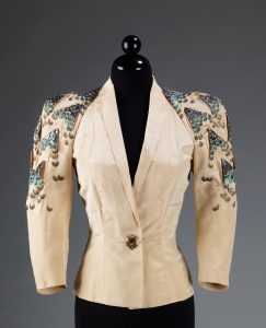 Some of the most iconic Rogers examples include an evening dress embroidered in metallic threads forming a tune in musical notes accessorized by a belt with a music box in the buckle from her 1939 “Music” collection. A clear plastic (Rhodoid) necklace crawling with colored-metal insects, part of her 1938 “Pagan” collection. A brown tweed pantsuit with architectural jacket and cuffed pants from 1939 and a day coat with bullet casings for buttons from the early 1930s, an audacious early expression of Schiaparelli’s outré stylistic vision